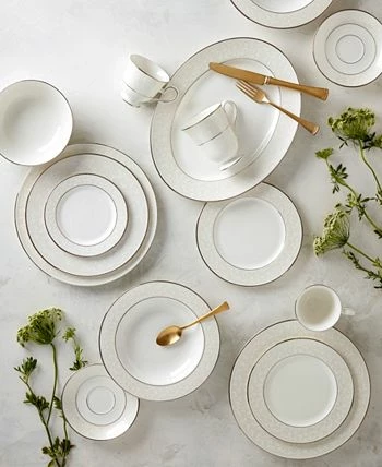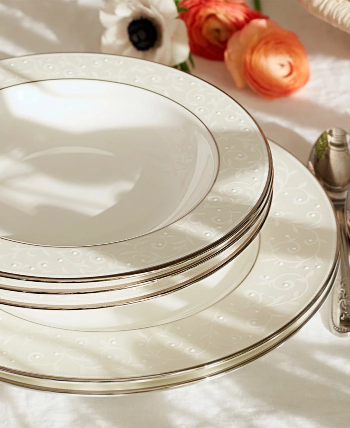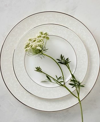 Pure opulence. Posh opalescence. This classically designed line of dinner plates from Lenox’s dinnerware and dishes collection are accented by a platinum rim and a delicate flourish of vine-like, white-on-white imprints with raised, iridescent enamel dots. Great gift for housewarming, wedding or yourself. Dinner plate shown center.
