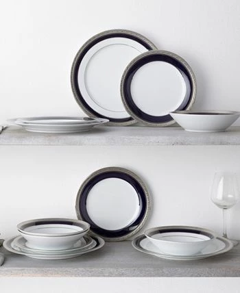 Crestwood cobalt platinum brings sophisticated elegance to the table. This stunning pattern features crisp bright white porcelain, paired with an inner band of deep cobalt blue for a look of elegant simplicity. The exterior platinum band is etched with a design of scrolling leaves.