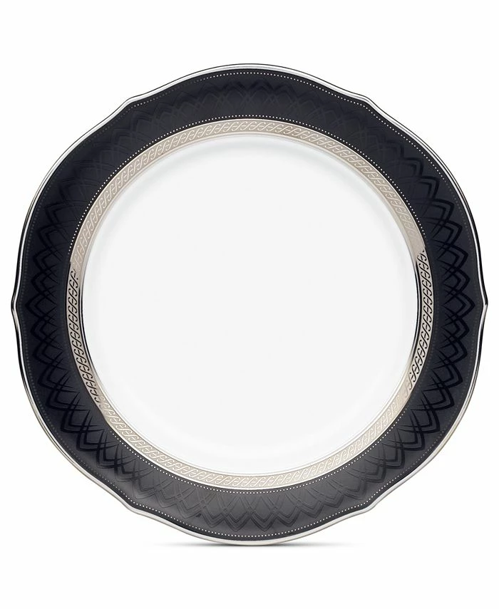 An instant classic, the Austin Platinum accent plate from Noritake layers patterned black and platinum bands with shimmering dots in white fine china. A scalloped edge adds a charming antique touch.