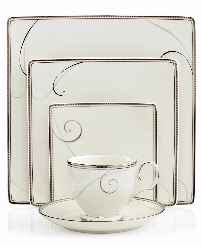 Fluid platinum scrolls glide freely through this stunning and, in a new square shape, sleek Platinum Wave dinnerware from Noritake. The square plates are given a timeless look in dishwasher-safe porcelain for fine dining or luxurious everyday meals. Coordinates with Platinum Wave and Eternal Wave stemware.