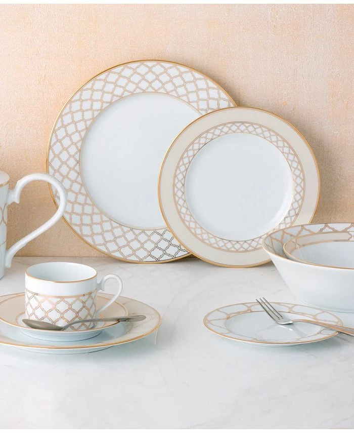 Eternal Palace features an interlocking stylized ogee design, presented in multiple sizes on different pieces for maximum impact. These modern elements are paired with solid presentations of a classic gold banding.