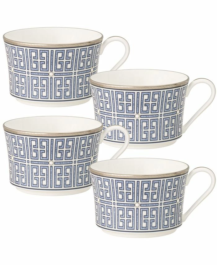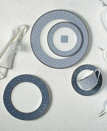 Infinity Blue is a bold pattern on bone china. Items are adorned with a fret pattern, interpreted as interlocking keys and blocks in shades of blue. Additionally, Infinity Blue items are embellished with raised enamel dots and 2 types of platinum banding.