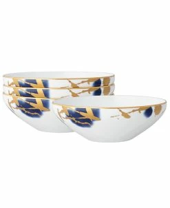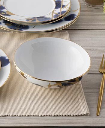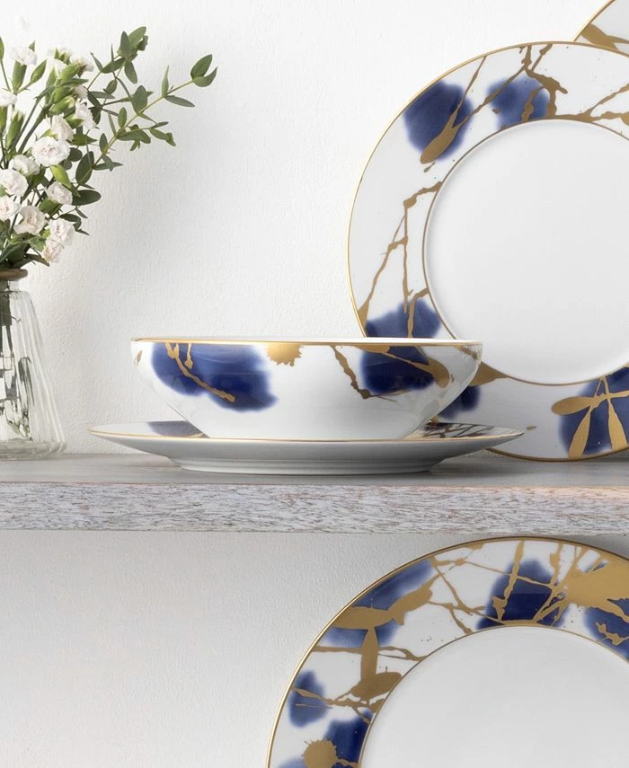 Jubilant days gold is an abstract celebration, featuring a base of random swatches of cobalt blue, and splashes of shimmering gold-tone on white porcelain. Jubilant days gold offers place setting components as well as an array of serving pieces and accessories.