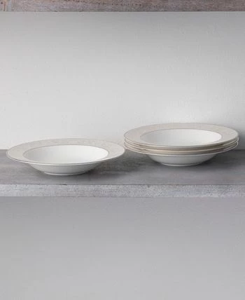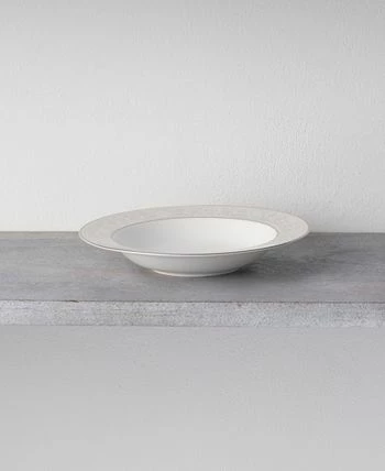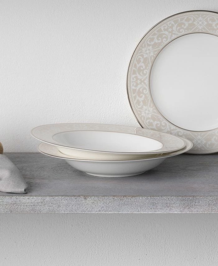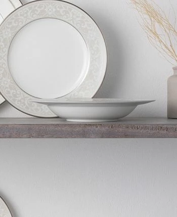 Montvale platinum features a narrow rim decoration of delicate white scrolls laid over a champagne-colored background, edged in platinum. Crafted in fine bone China, Montvale platinum offers place setting components as well as an array of serving pieces and accessories.