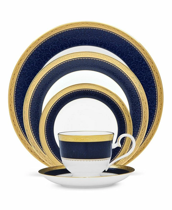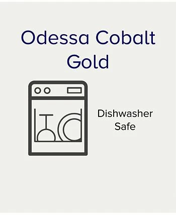 Odessa Cobalt Gold features a wide, etched gold band, coupled with a wide inner band of delicate soft blue floral scrolls over a deep, cobalt blue. Gold Band. Dishwasher Safe. Bone China.
