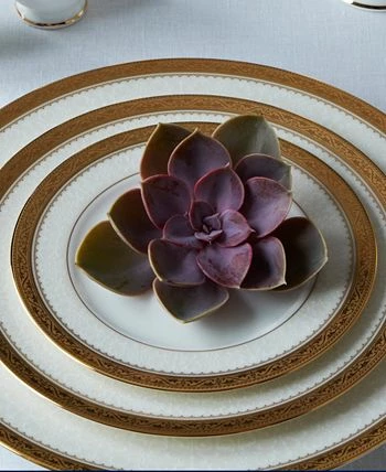 Odessa gold features a wide, etched gold-tone band, coupled with an inner band of delicate white floral over a whisper of dove gray. Crafted in fine bone China, Odessa gold offers place setting components as well as an array of serving pieces and accessories.