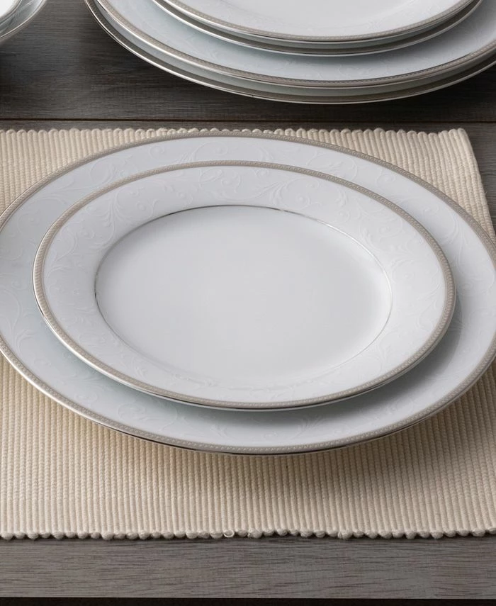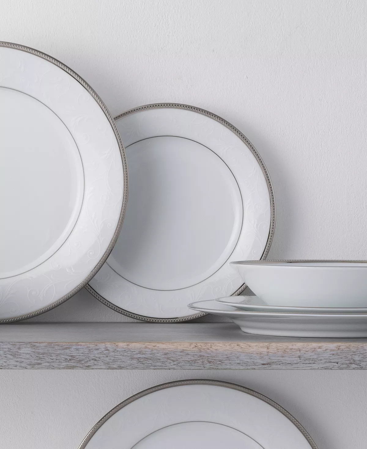 Regina platinum features a white-on-white, raised enamel, scroll-like design edged in etched platinum for a simple, classic look. Crafted in white porcelain, Regina platinum offers traditional place setting components, additional items, and a wide selection of serving pieces.