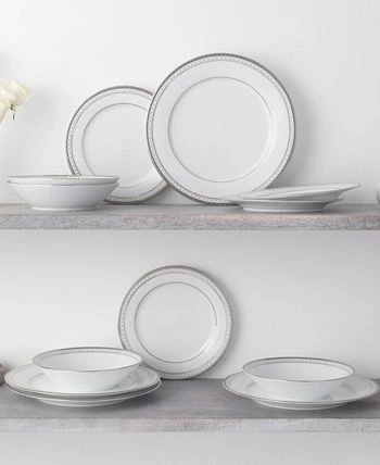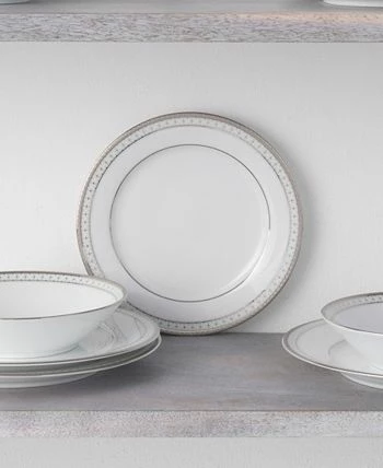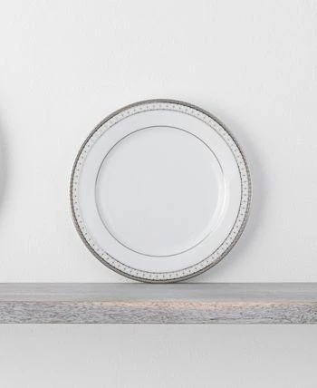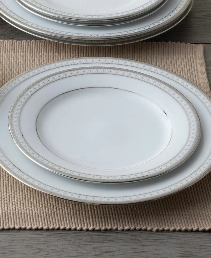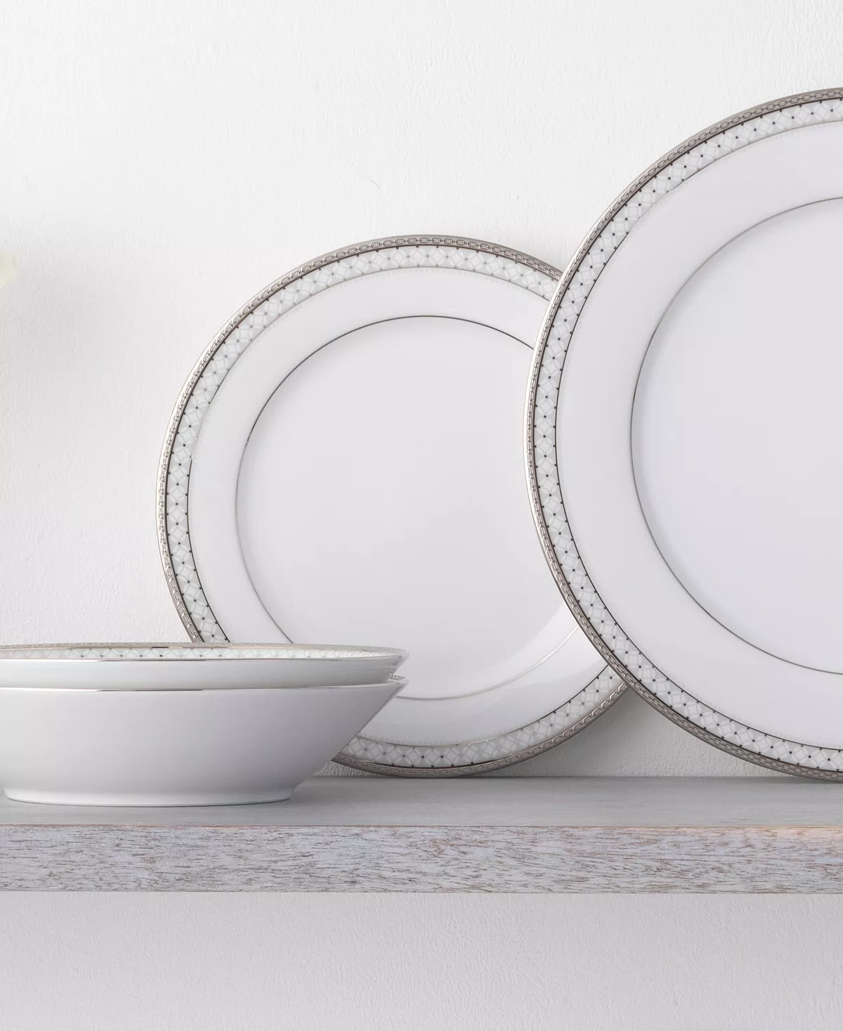 Rochester platinum features a circular grid, paired with platinum-on-platinum embossing, white embossing, and mica accents, all on classic white porcelain.