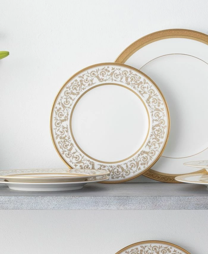 Summit gold is a mix of textures and visuals, pairing traditional and modern elements on bone China. Incorporated for more depth are touches of a finely speckled gray and monochromatic looping floral elements.